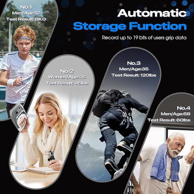 - [Smart Team Progress Tracking]-The compact handgrip trainer tester is perfect for youth and adult sports teams. It can store up to 19 user profiles with full gender and age details, facilitating progress tracking. It can recall the last grip strength test record for each profile and clearly show whether the current hand strength has increased or decreased.