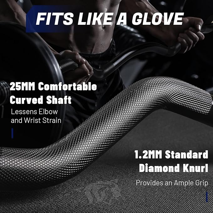 - Comfortable Curved Shaft with Standard Knurling: The bent shaft of our curl bar is designed for maximum comfort and effectiveness. The thoughtfully crafted cambered angles place your hands in a natural position, significantly reducing strain on your elbows and wrists. And 1.2mm standard diamond knurl provides an ample and superior grip for any movement from curls to rows even with sweaty hands.