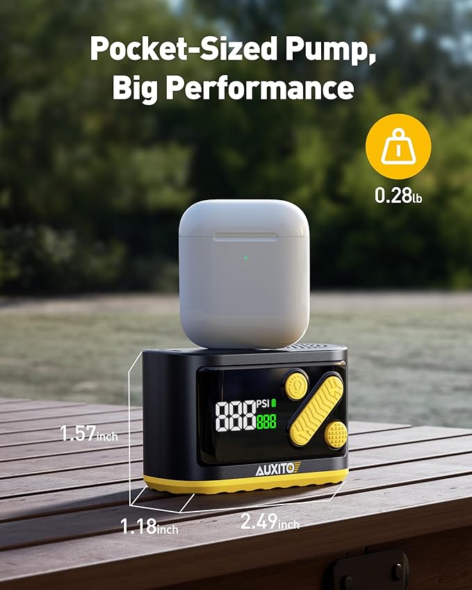 - 【POCKET-SIZE & POWERFUL INFLATION】AUXITO bicycle pump is super compact and lightweight—just 0.28lb and 2.99 inches in length—making it perfect for cyclists, travelers, and outdoor enthusiasts who need portable convenience. Powered by a built-in 2000mAh high-capacity battery and a brushless motor, it delivers fast inflation and can refill up to 7 flat tires after fully charged