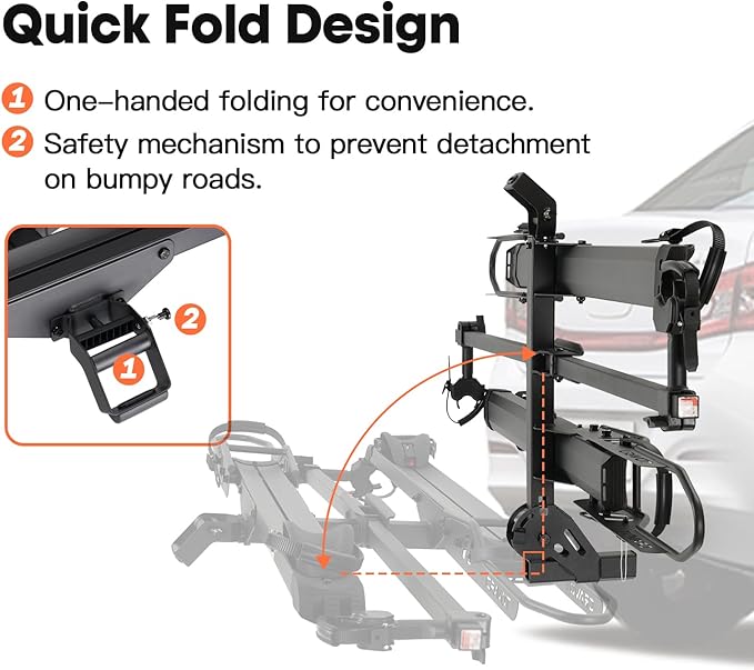 - 【Updated Compatibility & Stability】The new updated V-shaped front wheel cradle, fit to more tire sizes. The vertical rod's connecting block features a semi-enclosed design. With its sturdy bolt system and shock-absorbing threads, this fat tire E-bike hitch rack ensures unparalleled stability on any terrain. Refer to manual or download the E-manual for installation.