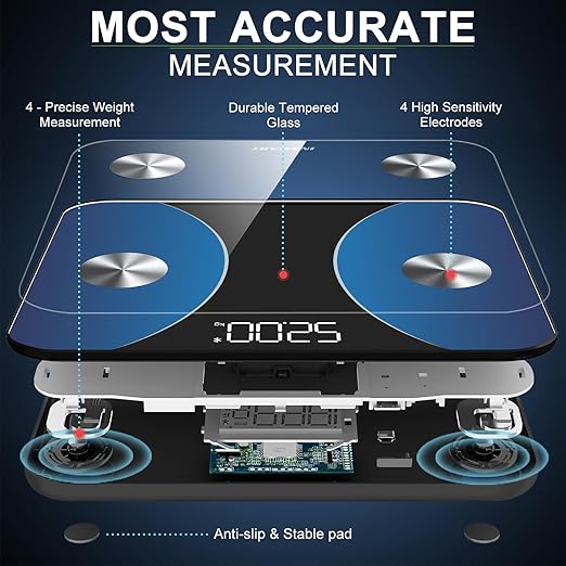 - 【HIGH ACCURACY WEIGHT SCALE】This ultra-precision scale for body weight, adopting the advanced BIA technology,the health scales is equipped with 4 high sensitive electrodes and 4 high precision and electrodes to ensure the accuracy.The digital scale self-Illuminated LED display provides clear readout at any angle.The fat scale ensures accurate measurement results to within 0.2lb/ 0.05kg and has a maximum weight capacity of 400lb/180kg