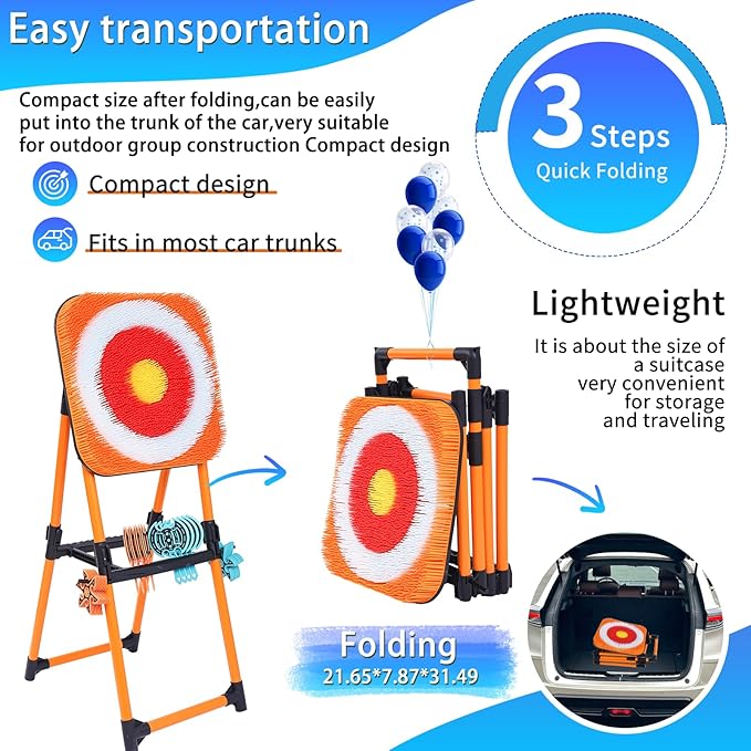 - PORTABLE STORAGE: axe throwing set, long handled axe special storage slot, star dart storage hanging rod, beautiful and good storage, when the game is over axe throwing target can be folded into a square with the 2 sides of the bracket, the target will be hung on the rod, easy to can be put it into the trunk, go out camping and potluck outdoor games, at home you can also feel free to stow it in any exchange.