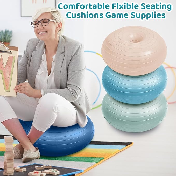 - What You Receive: you can get 8 pcs flexible seating designed with donut shape and 8 colors, gray-white, gray, lake blue, gray-green, water blue, light apricot, sky blue, dark blue, each about. 20 x 20 x 8.8 inches, 1 pcs inflator, inflatable can provide kids with even a correct sitting experience, can provide effective cushioning for children and protect their hips
