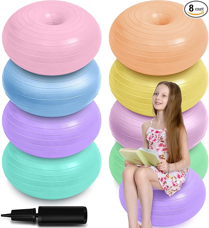 Lewtemi 8 Pcs Flexible Seating for Classroom Elementary 20'' Yoga Ball Chair Large Inflatable Donut Exercise Ball Chair Wobble Seat with Inflator for Kids Student Balance