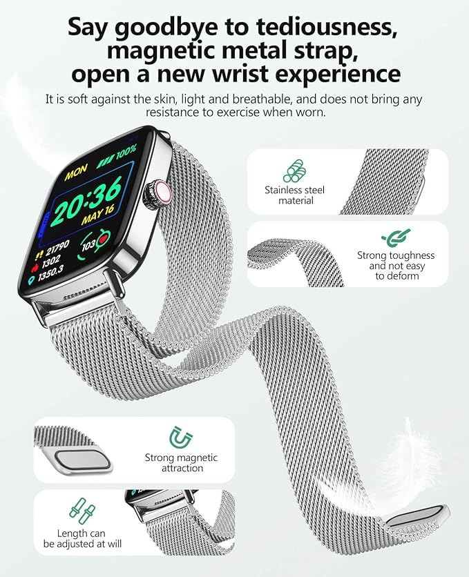 - 【Smart Ecosystem and Interactive Innovation】Invoke Siri and Google Assistant via BT for convenient AI voice control. Dual microphones enhance noise reduction, improving command recognition by 30% in noisy environments. Answering and making calls are effortless, with real-time access to various short messages. Your health manager intelligently reminds you to drink water, take breaks from sitting, monitor blood oxygen and stress abnormalities, and provides synchronized care for female cycles.