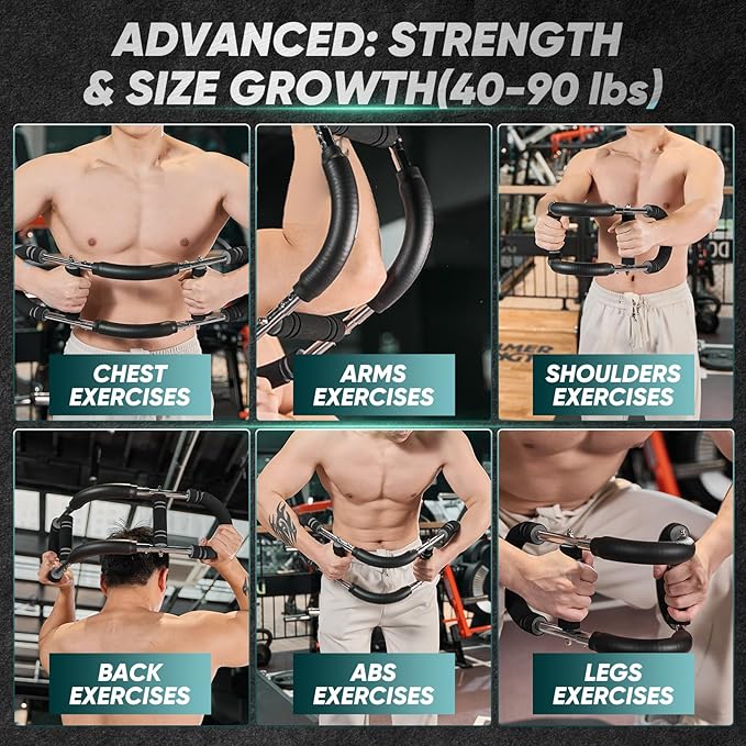 - 【HOME FITNESS EQUIPMENT】SakerPlus twister arm trainer features a unique U-shaped design with 3 resistance options (20-60lb, 40-90lb, 70-110lb), allowing precise muscle stimulation through different grip positions. Ideal for home workouts, it effectively targets the chest, arms, shoulders, back and thigh, helping you build strength like a bodybuilder.