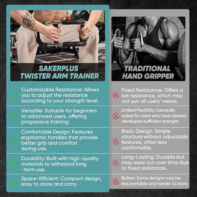 - 【HOME FITNESS EQUIPMENT】SakerPlus twister arm trainer features a unique U-shaped design with 3 resistance options (20-60lb, 40-90lb, 70-110lb), allowing precise muscle stimulation through different grip positions. Ideal for home workouts, it effectively targets the chest, arms, shoulders, back and thigh, helping you build strength like a bodybuilder.