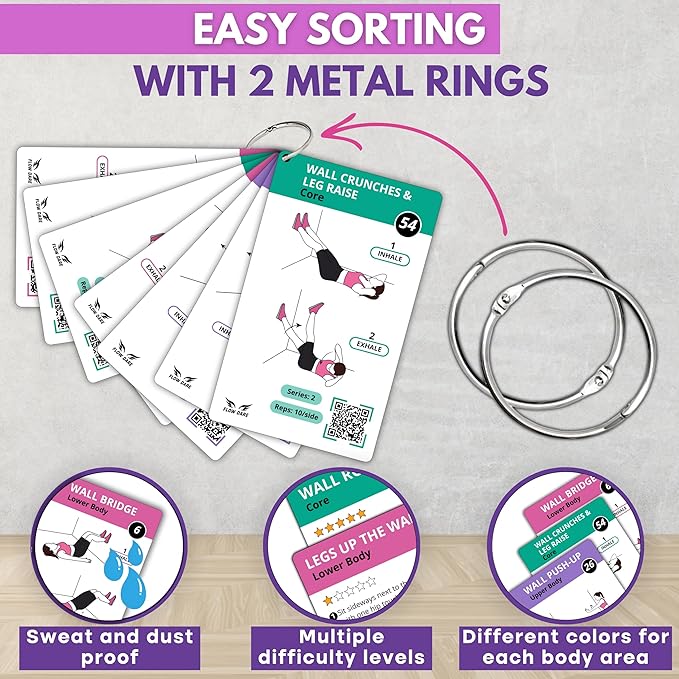 - STAY ORGANIZED & ON TRACK - Includes 2 metal rings for easy sorting and flipping during workouts. No more messy piles, keep your routine neat and accessible. The cards are also color-coded (Upper Body, Lower Body, Core, Total Body), so finding the right move is quick and easy.