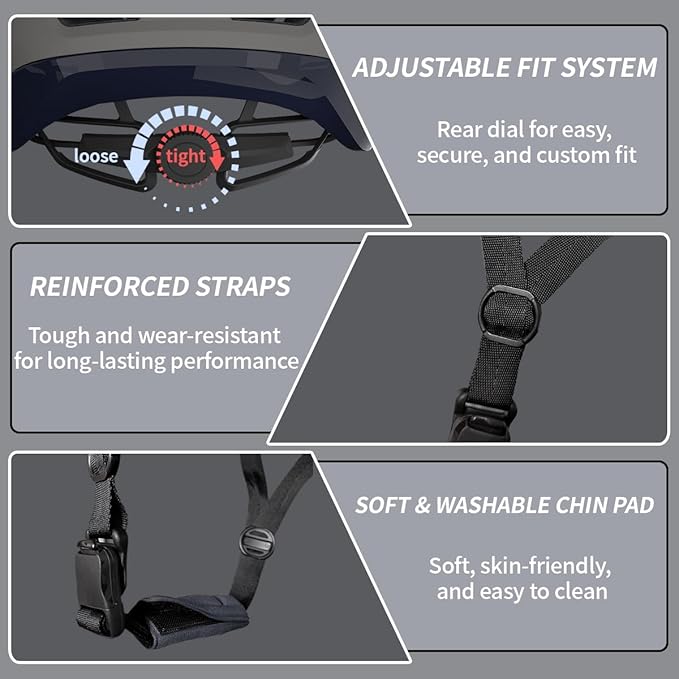 - ADJUSTABLE FIT FOR LASTING COMFORT:This bike helmet features a 360 degree dial fit system, height-adjustable rear cradle, soft and detachable chin pad, and durable, tear-resistant straps to deliver a personalized and secure fit. The flexible adjustment system allows sizing to be tailored to individual needs, minimizing pressure points and enhancing overall comfort for a stable, distraction-free ride