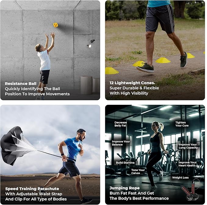 - "Agility Training Equipment Kit": Includes a 2 * 20ft agility ladders with 8 ground stakes, 4 agility hurdles, 12 vibrant yellow disc cones, and a high-resistance running parachute. Perfect for all skill levels—from beginners to pros—this set is built to elevate your speed, coordination, and overall athletic performance.
