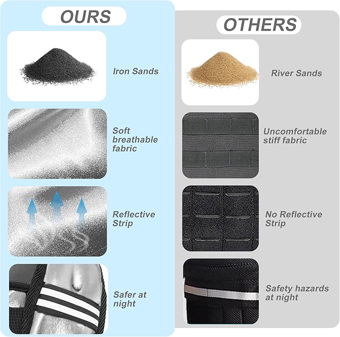 - Adjustable Straps & Reflective Stripes: Each weighted vest has adjustable straps to prevent slipping or sliding, ensuring a better fit for users of all chest sizes and improving exercise efficiency. The reflective strips on both sides of the weighted vest reflect vehicle headlights for safer night running, keeping you away from traffic accidents in any weather conditions (rain, fog, darkness), day or night