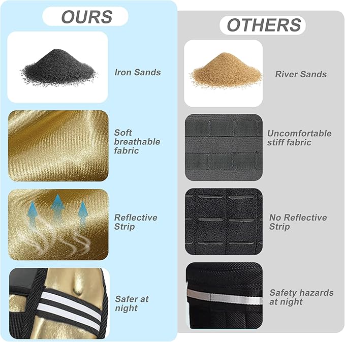 - Adjustable Straps & Reflective Stripes: Each weighted vest has adjustable straps to prevent slipping or sliding, ensuring a better fit for users of all chest sizes and improving exercise efficiency. The reflective strips on both sides of the weighted vest reflect vehicle headlights for safer night running, keeping you away from traffic accidents in any weather conditions (rain, fog, darkness), day or night