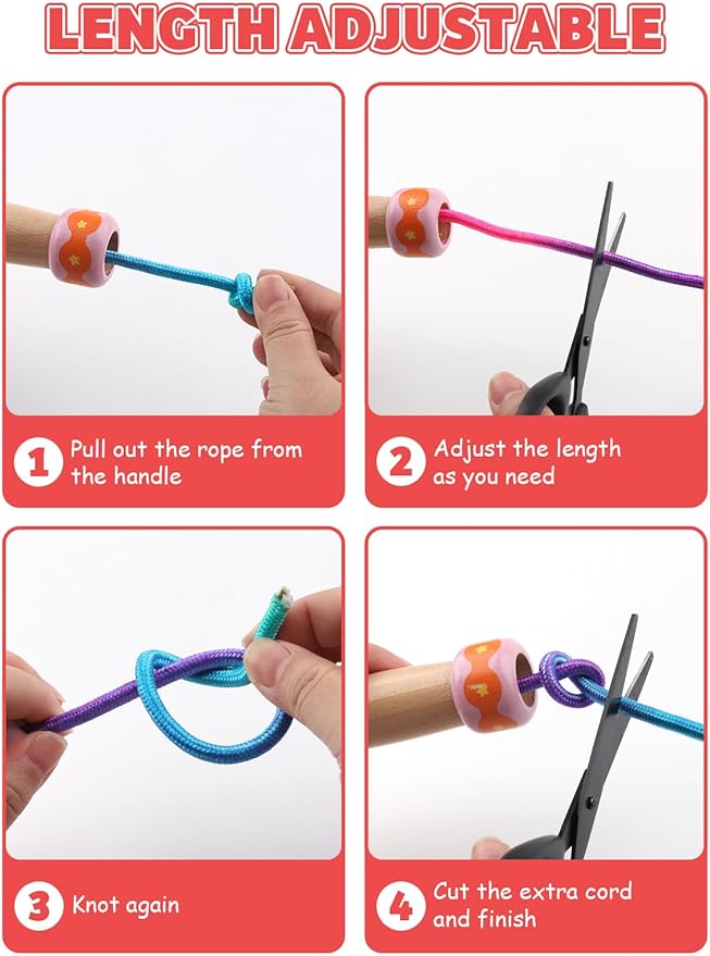 - 【PREMIUM】Quality wood and integrated design make this handle not easy to break. Cotton outer braided rope, cotton weave and rubber inner, which is soft and is not easy to knot and bend, which can prevent kids' legs from being scuff when jumping.