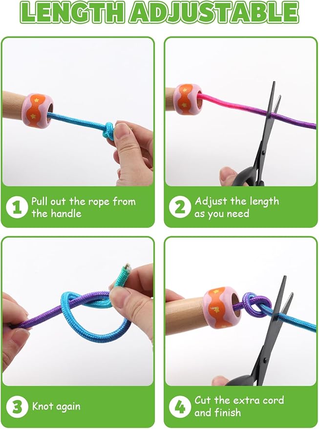 - PREMIUM - Quality wood and integrated design make this handle not easy to break. Cotton outer braided rope, cotton weave and rubber inner, which is soft and is not easy to knot and bend, which can prevent kids' legs from being scuff when jumping.