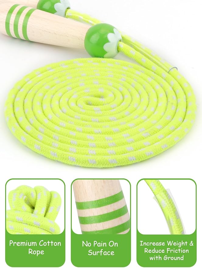- KIDS JUMP ROPE - You will get 1 pcs 8.5ft/2.6m length children's skipping ropes with wooden handle(Green), which boys and girls like. Fun activity games can play with friends or family.