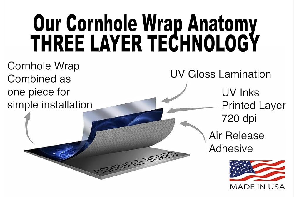 - DURABLE OUTDOORS - You'll be happy to know that these cornhole wraps have an extra layer of protection with a UV gloss lamination. This means you won't have to stress about them cracking, peeling or fading anytime soon!