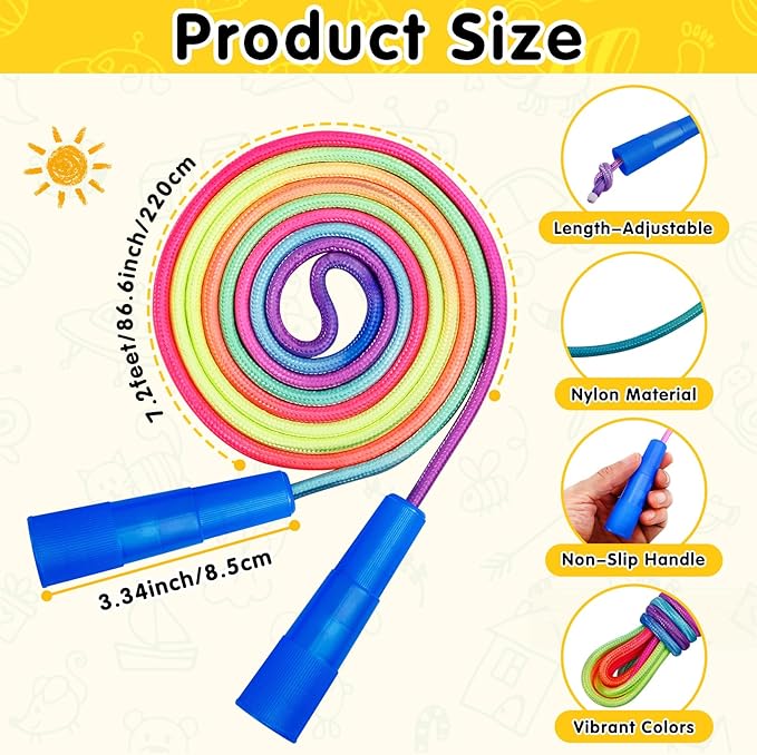 - Sufficient Quantity: There are 10 pieces of kids rainbow jump ropes within each package, sufficient quantity can meet your daily needs or play with friends or family. Each jump ropes for kids is with a reasonable size of 7.2 feet / 2.2m and the colors of rope handles are random.