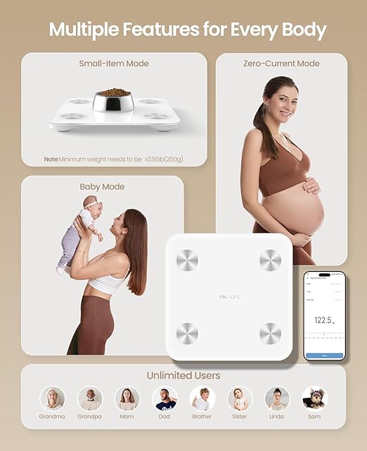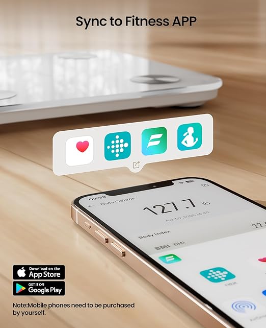 - Family Fitness Tracking & App Sync: This body scale supports unlimited users and baby/pet weighing mode, seamlessly syncing with Samsung Health, Fitbit, and Apple Health. Enjoy motivational tracking, historical data storage, and daily/weekly/monthly progress monitoring - all with one weight scale for your family's wellness journey.