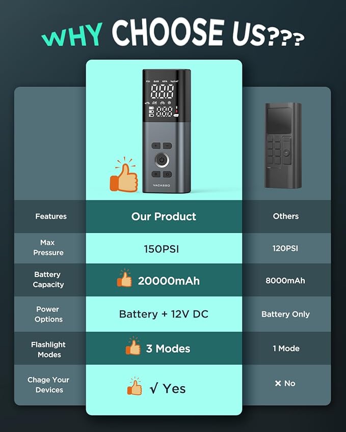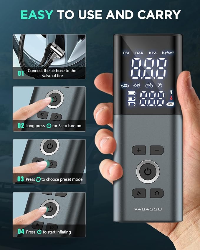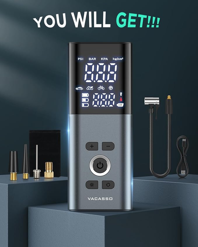 - ACCURATE TIRE PRESSURE GAUGE: Built-in Intelligent Chip, VACASSO KY103 advanced air pump for car tires features precision pressure monitoring and a large dual LED display, and it will be auto off as soon as preset pressure is reached to prevent overinflation, ensuring tire safety and freeing your hands for other tasks