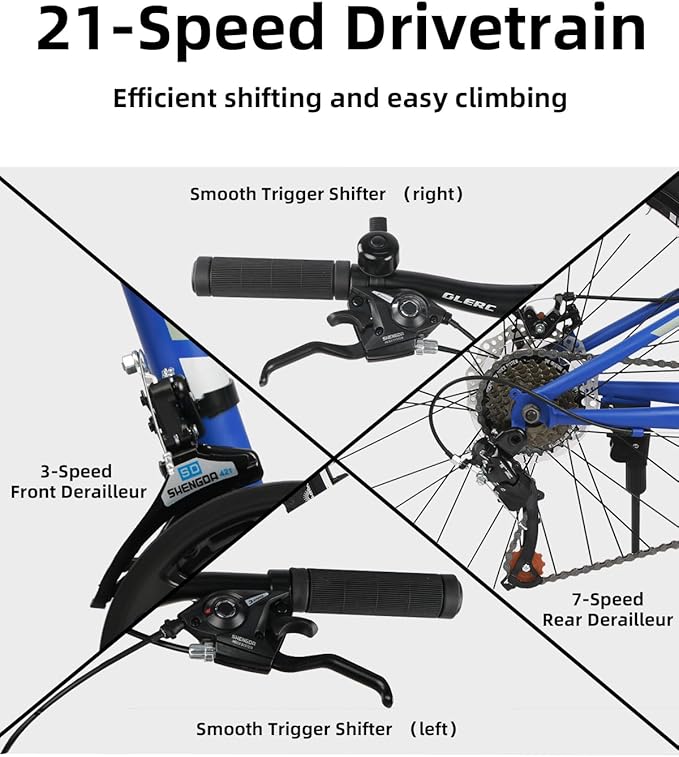 - 【Ride Anytime】This mountain bike is equipped with a 21-speed drivetrain, offering versatile speed options to tackle diverse terrains, while its smooth and efficient gear shifting further elevates the riding experience.