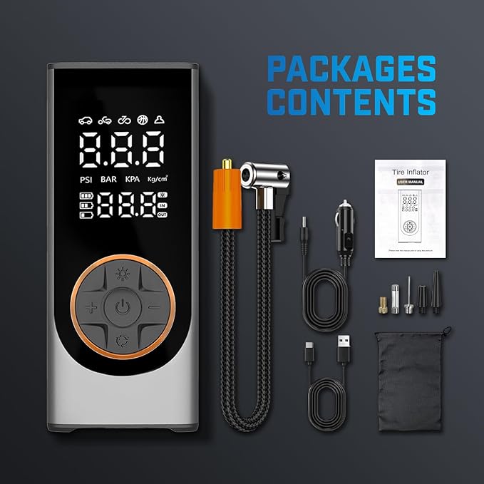 - π Long Battery & Built-in LED Light: This car tire air pump portable has a 6000mAh battery and a bright LED with three modes, ideal for nighttime use, tire changes, and emergencies. It also functions as a flashlight when needed.