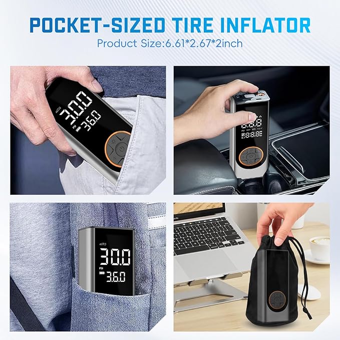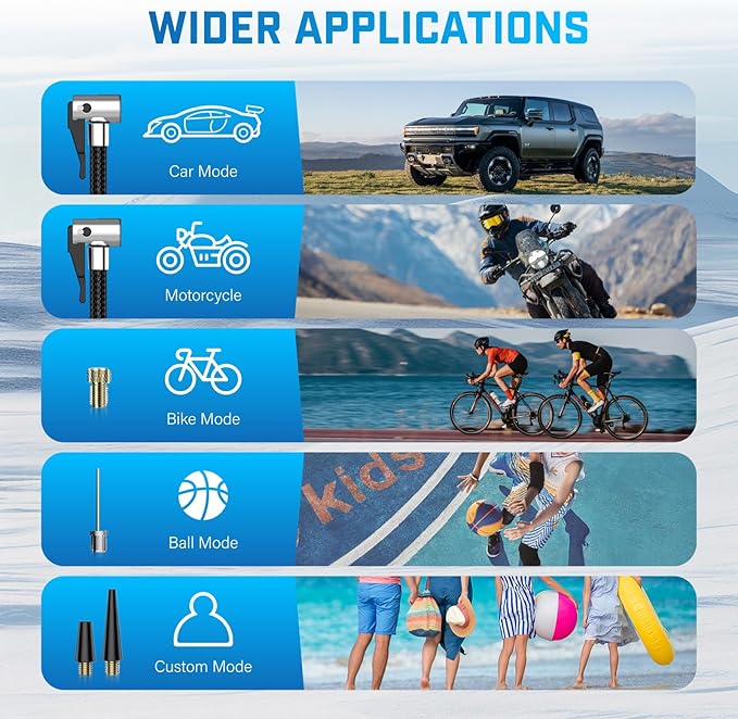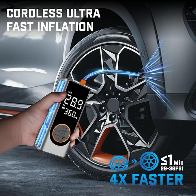 - π 4X Fast Inflation & 5 Modes: This tire inflator portable air compressor delivers a maximum 150 PSI & 35 L/min airflow, inflating a car tire (29-36 PSI) in under 1 min. Features 4 preset modes: car, motorcycle, bike, and ball.