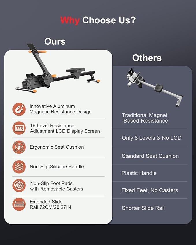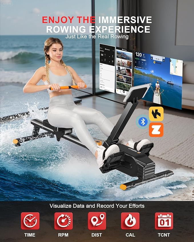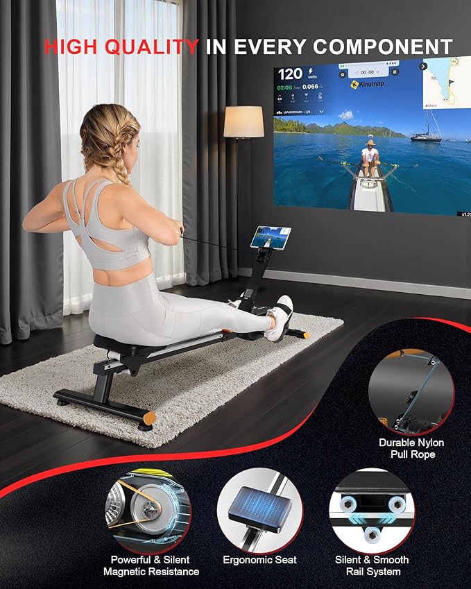 - Dual Silent System: The non-contact magnetic resistance system delivers a virtually silent rowing experience. High-density steel reduces noise, changing your daily rowing into pleasure. You can enjoy your workout without worries anytime