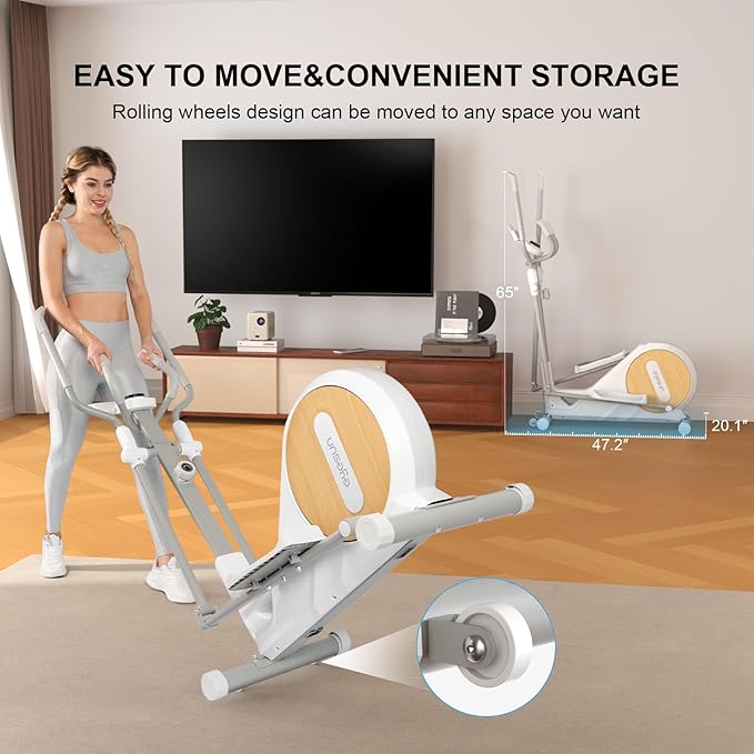 - SPACE-SAVING, DURABLE, AND EASY TO MOVE: Built with a heavy-duty steel frame and 330 lb capacity,this portable elliptical is made to last.Compact footprint (47"x20"x65") fits in any room and saves 20% more space than typical foldable ellipticals.Front transport wheels make it easy to relocate or store.