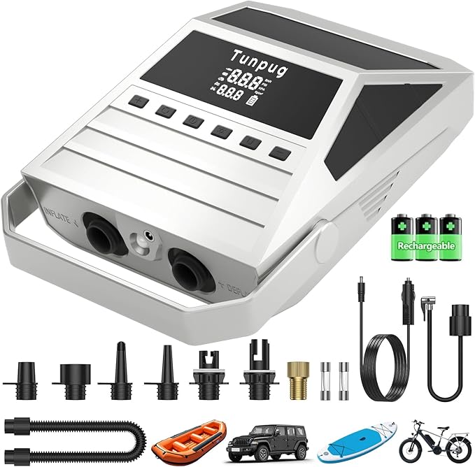 - ๐โโREAL-TIME NUMERIC DISPLAY & LED LIGHTS๏ผInflatable Paddleboard Pump LED numeric display effortlessly monitors pressure levels for precise control and efficient operation. Electric pump for inflatables equipped with two-way electric lights for nighttime use and emergency signal lights ensures safety and visibility in low-light conditions.