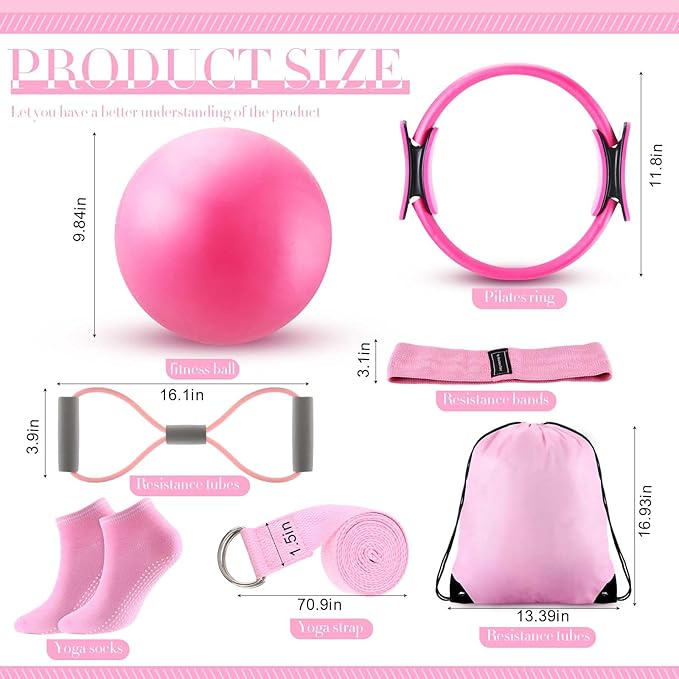 - Versatile Exercise Equipment Set: the exercise equipment set consists of 2 pilates rings, 2 pilates balls, 2 yoga straps, 2 pieces of 8 shape resistance bands, 2 fabric resistance bands, 2 pairs of non slip socks, 2 gym bags; This is a considerate and complete set purposely designed to cater for your diverse workout needs; The two sets of Pilates equipment in pink can be shared with your close friends and enjoy the fun of exercising together
