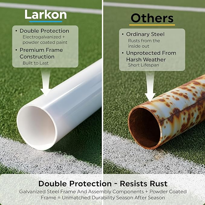 - Train in Any Weather: Rain or shine, practice doesn’t stop. This goal is built to take the elements so players can keep improving year-round. Leave it out with confidence - no saggy nets or rusting frames here with our dual coating galvanized and painted frame.
