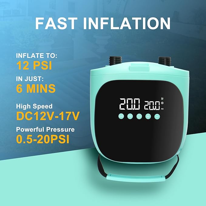 - 20PSI High-Pressure Performance – Effortlessly inflates stand-up paddle boards (SUPs) to 12-15 PSI in minutes, perfect for rigid, high-pressure water sports gear.