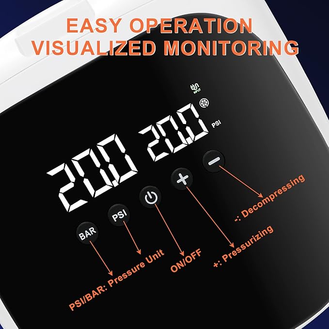 - Real-Time LED Display – Monitor PSI levels, set presets, and toggle between Auto/Low/High modes with the intuitive digital screen.