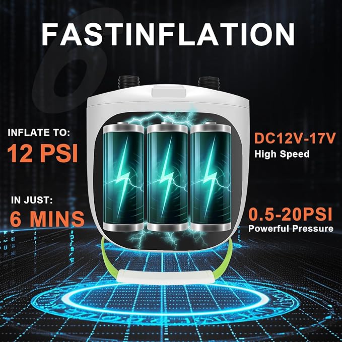 - 20PSI High-Pressure Performance – Effortlessly inflates stand-up paddle boards (SUPs) to 12-15 PSI in minutes, perfect for rigid, high-pressure water sports gear.