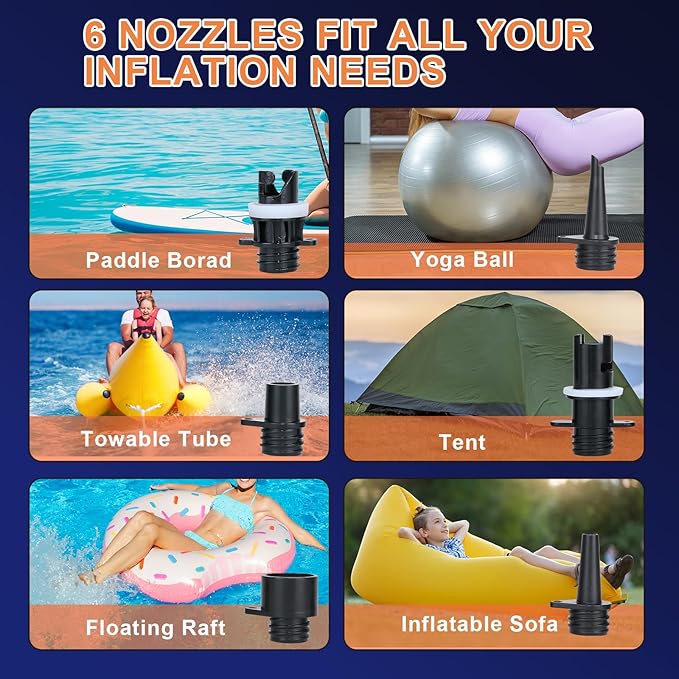 - Multi-Device Compatibility – Works with SUPs, inflatable kayaks, air mattresses, tents, pool floats, boats, and kiteboarding gear.