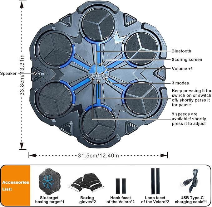- [Durable & Safe Design]Built with high-strength materials, this Music Boxing Machine is sturdy and reliable, designed to withstand intense training. Its non-slip, wear-resistant surface ensures safety during workouts, making it perfect for kids.(With Velcro, ONLY USB connection)(Hexagon, length: 9.45 inch, width: 10.14 inch)