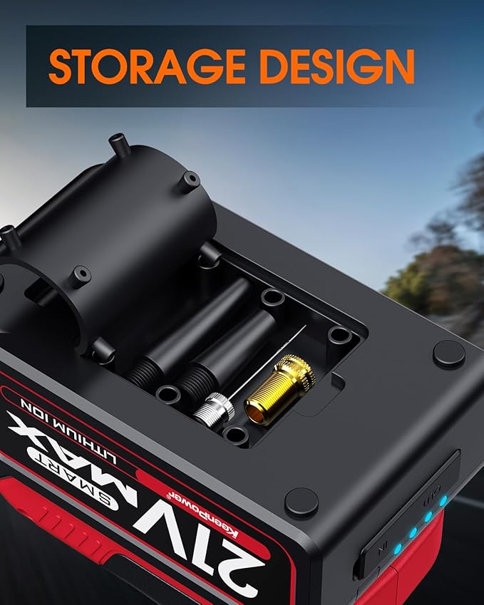 - 【Dual Power Supply: Always Ready】This battery powered air compressor comes with a 21V rechargeable lithium battery and a backup 12V DC car adapter, ensuring uninterrupted performance. Whether you're at home, on the road, or outdoors, you'll never be left without a reliable power source.