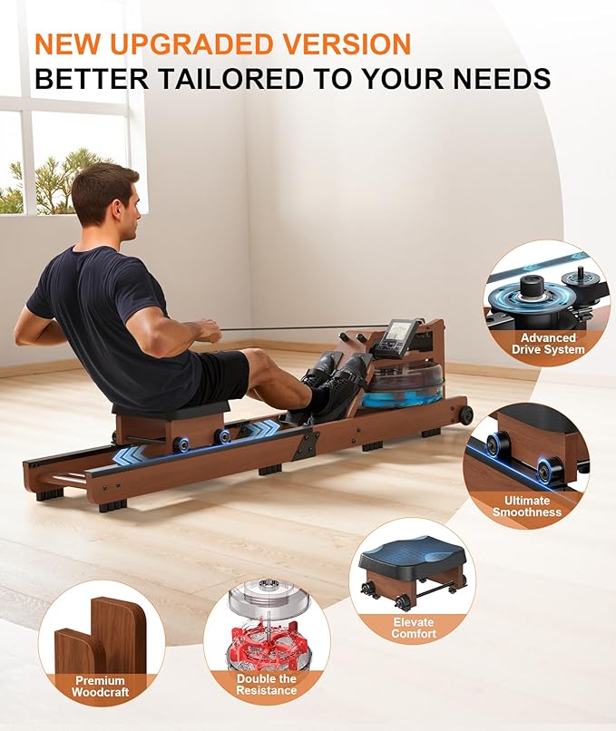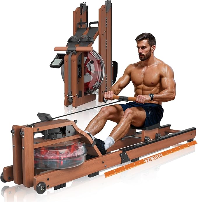 - Foldable Design:Crafted from high-quality premium rubber wood, this rowing machines for home features a durable, stylish frame that combines natural elegance with modern design,The foldable structure saves space and fits seamlessly into any home or gym. A stable, low-center base minimizes wobbling for a smoother, safer workout.The oversized water tank provides ample resistance, allowing you to adjust your rowing speed and time for a more realistic, immersive experience.