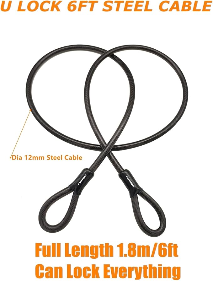 - Security & Anti-Theft: Lock has 14mm steel shackle and wrapped with additional 1.5mm PVC cover. Each U lock with 6ft dia 12mm steel cable, long enough cable can lock everything