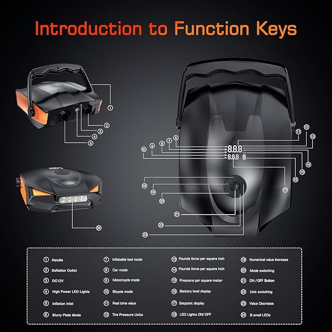 - ๐โโ 5 Preset Modes & Custom PSI Adjustment : SUP mode default pressure value 15PSI, inflatable bed mode default pressure value 0.4PSI, car mode default pressure value 36PSI, motorcycle mode default pressure value 35PSI, bike mode default pressure value 45PSI; 5 modes have set default PSI. You only need to adjust to the corresponding mode can be assured that you can use, but also free to adjust the size of the pressure value!