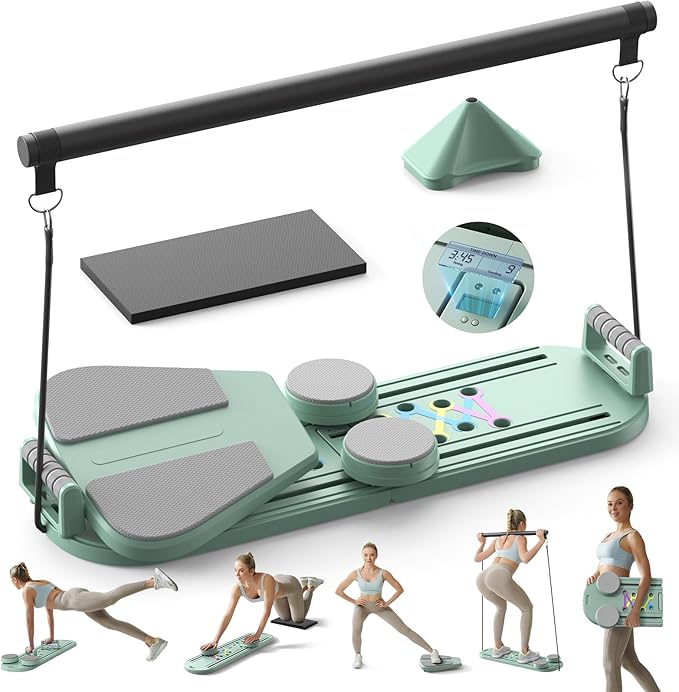- 【Multifunctional Pilates Board】Warm Tips: Please don't use the product when it is folded,it can be used after it is fully unfolded.All exercises in one pilates reformer set! It combines the function of pilates board, ab roller wheel, resistance bands, push-up handles, balance board and planks.Whether you're a pilates equipment beginner or advanced pilate fitness enthusiast, Perfect for full body workout for body shaping, fat loss, and improving body function and flexibility.