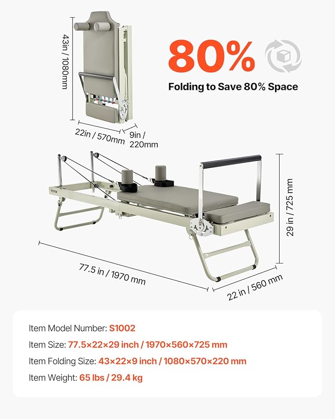 - Foldable Design: This pilates equipment for home workouts can be folded in just a few minutes, making it easy to store in tight spaces, either upright or horizontally. When folded, it measures 43x22x9 inches, taking up minimal storage space. It allows for more freedom and comfort during workouts, making it ideal for private homes or professional fitness studios
