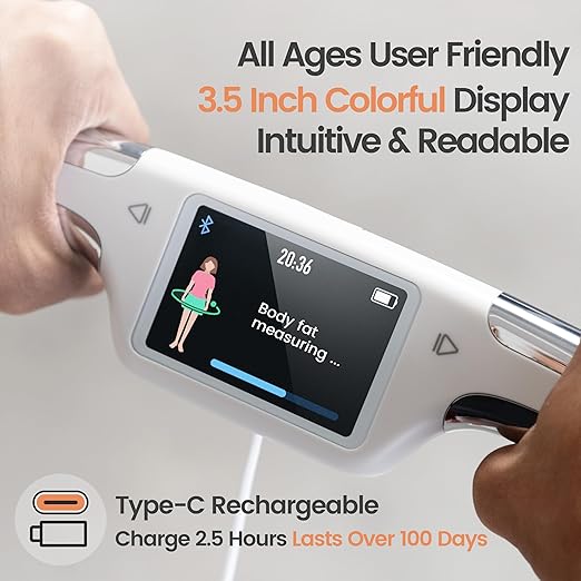 - Large TFT Screen & Retractable Electrodes – A 3.5-inch colorful display shows results clearly without bending. Retractable handles with electrodes reset automatically after each use—saving space and avoiding tangled cords.