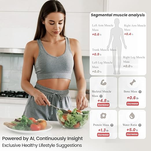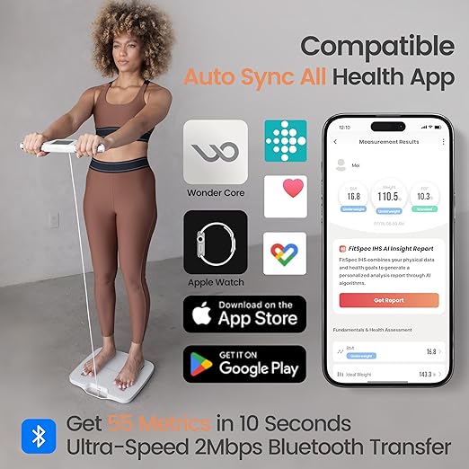 - 55 Body Metrics & Fast Bluetooth Sync – Perform a 55-point full-body composition analysis in seconds. Sync seamlessly with popular health apps, including Apple Health, Samsung Health, and Google Fit, for easy tracking across your devices.
