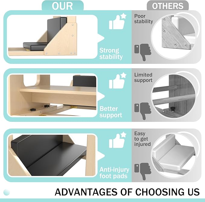 - [Premium Wood Design]: Pilates reformer adoption of Solid wood design allows for home or professional use. Equipped with specific leather, which is tear-resistant, wear-resistant, anti-aging, breathable, and not stuffy. The high-density EVA foam padded inside leather, is moderately soft and hard. Making your workout comfortable.