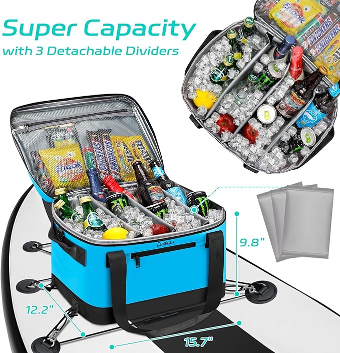 - SUPER SPACIOUS & WELL ORGANIZED - Super Large yet lightweight! Equipped with 3 removable dividers for customizable internal storage, the paddle board cooler can easily hold plenty of drinks, fruits, and even snacks. The top and inner features a zippered mesh pocket, while the exterior includes a waterproof pocket for storing keys or a phone. Perfect for SUP, Kayaking, camping, or picnicking!