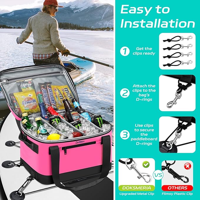 - UPGRADED SECURE ATTACHMENT SYSTEM - Different from most thin ropes with flimsy plastic clips, the sup cooler bag comes with 4 Reinforced Elastic Ropes with Metal Clips, making it easy to secure to the D-rings on your paddleboard. It also includes 2 extra-long elastic rope clips, allowing you to securely fasten the bag to your paddleboard, kayak, or other outdoor gear, providing enhanced stability for a more secure fit during your activities.