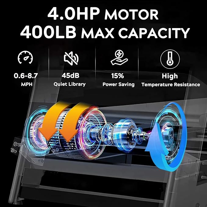 - 4.0 HP motor, 400LBS capacity, speed range: 0.6-8.7 MPH i.e. with a faster maximum speed than your average speed to improve your fitness level.