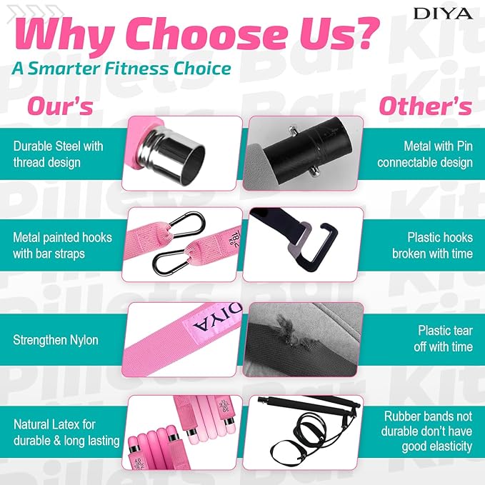 - ใ๐ฆ๐๐ฝ๐ฒ๐ฟ๐ถ๐ผ๐ฟ ๐๐๐ฟ๐ฎ๐ฏ๐ถ๐น๐ถ๐๐ & ๐ฆ๐ฎ๐ณ๐ฒ๐๐ ๐ณ๐ผ๐ฟ ๐ฃ๐ถ๐น๐ฎ๐๐ฒ๐ ๐๐ฎ๐ฟใTrust the DIYA pilates bar kit with resistance bands, built with a solid steel core and soft EVA foam grip. The 360ยฐ metal clips prevent "straps pivot" issues, ensuring safe workouts. Unlike competitors with "band broke" or "broke within short time" issues, this setup offers reliable performance for women and men.