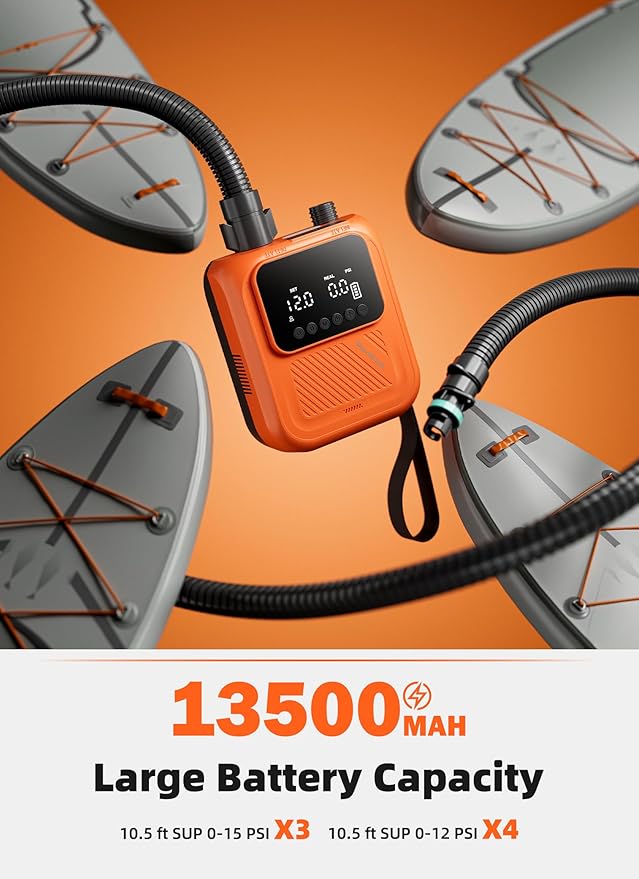- 【Quick Dual-Stage Inflation & 30% Faster】Inflate your paddle board fast and efficiently with dual-stage action: 350 L/min for quick filling, then 100 L/min for high-pressure precision. Inflate a board to 12 PSI in under 5 minutes and deflate in just 2—saving time for what matters: the water.